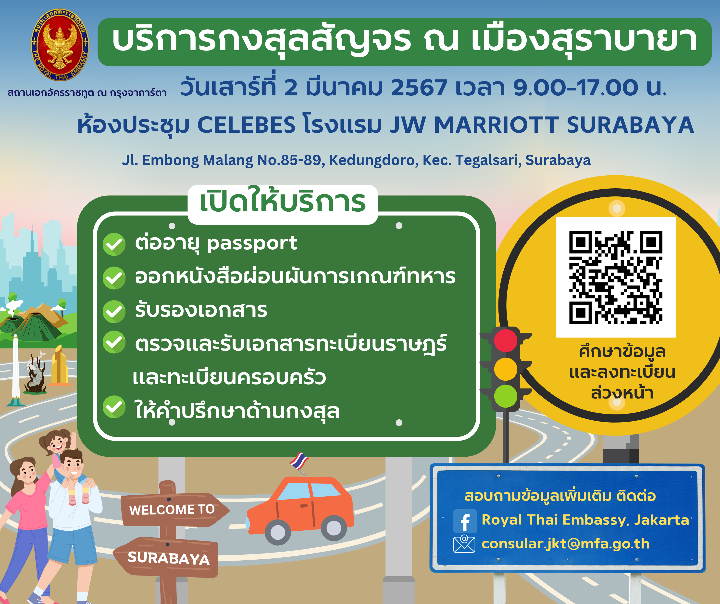 ขอเชิญผู้สนใจเข้ารับบริการกงสุลสัญจร ณ เมืองสุราบายา ในวันเสาร์ที่ 2 มีนาคม 2567