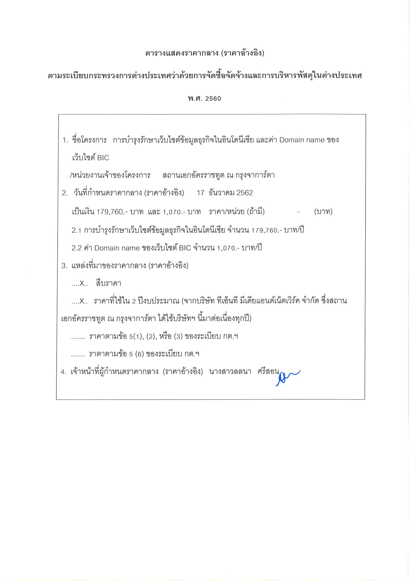 ประกาศราคากลางการบำรุงเว็บไซต์ข้อมูลธุรกิจในอินโดนีเซียและค่า domain name ของเว็บไซต์ BIC 17 ธ.ค. 2562