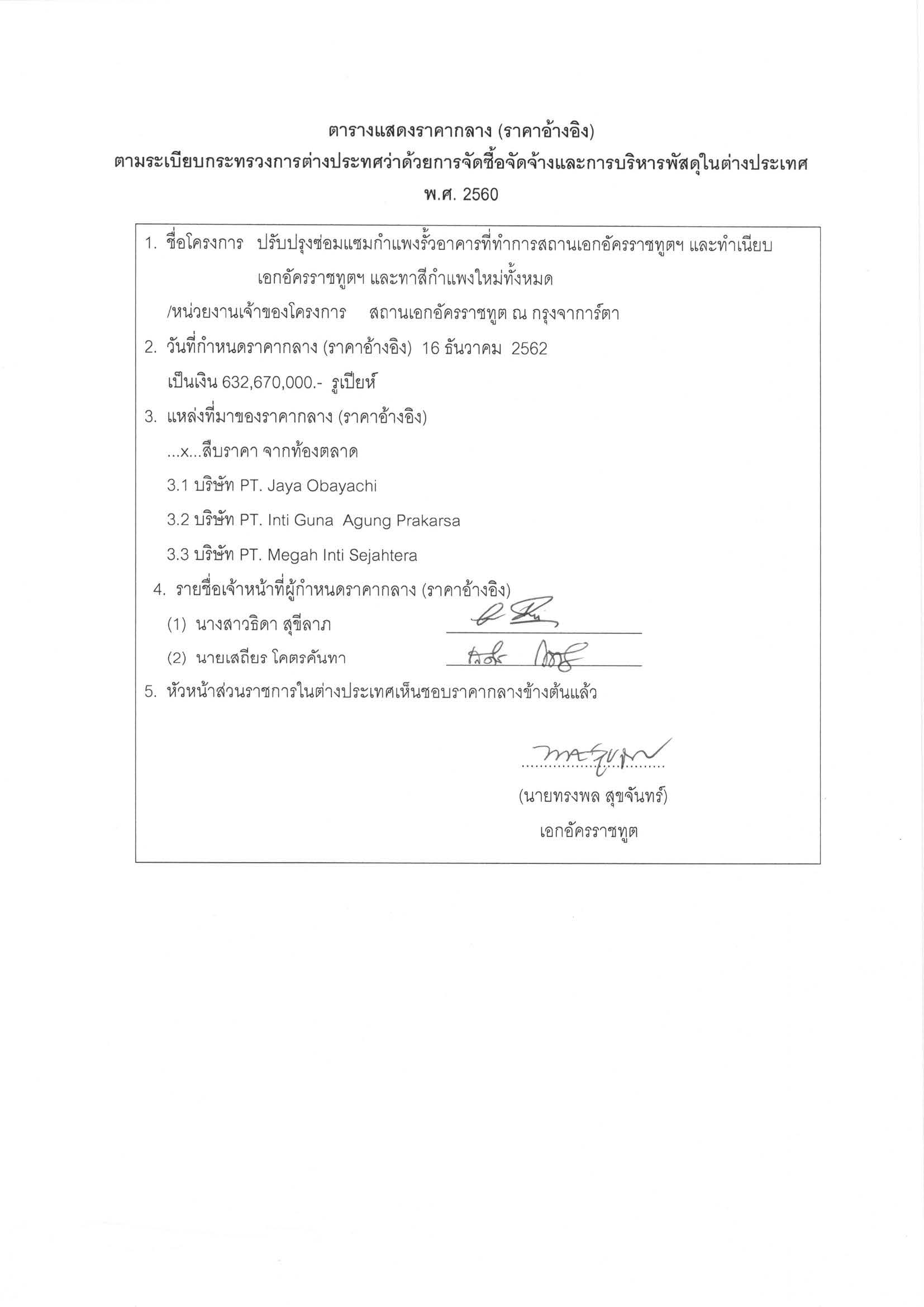 ประกาศราคากลางจัดจ้างเอกชนปรับปรุงซ่อมแซมกำแพงรั้วอาคารที่ทำการสถานเอกอัครราชทูตฯ และทำเนียบ เอกอัครราชทูตฯ และทาสีกำแพงใหม่ทั้งหมด 16 ธ.ค. 2562