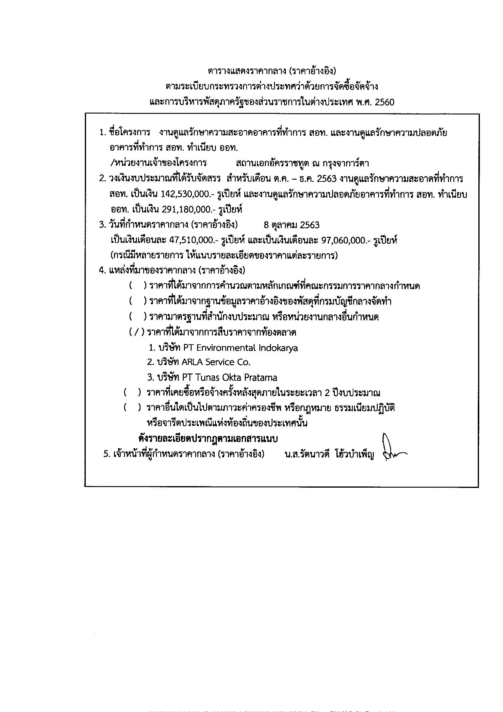 ประกาศราคากลางจ้างเหมาบริการทำความสะอาดอาคารสถานที่ของสถานเอกอัครราชทูตฯ และดูแลรักษาความปลอดภัยอาคารที่ทำการ สอท. ทำเนียบ ออท. 8 ต.ค. 2563