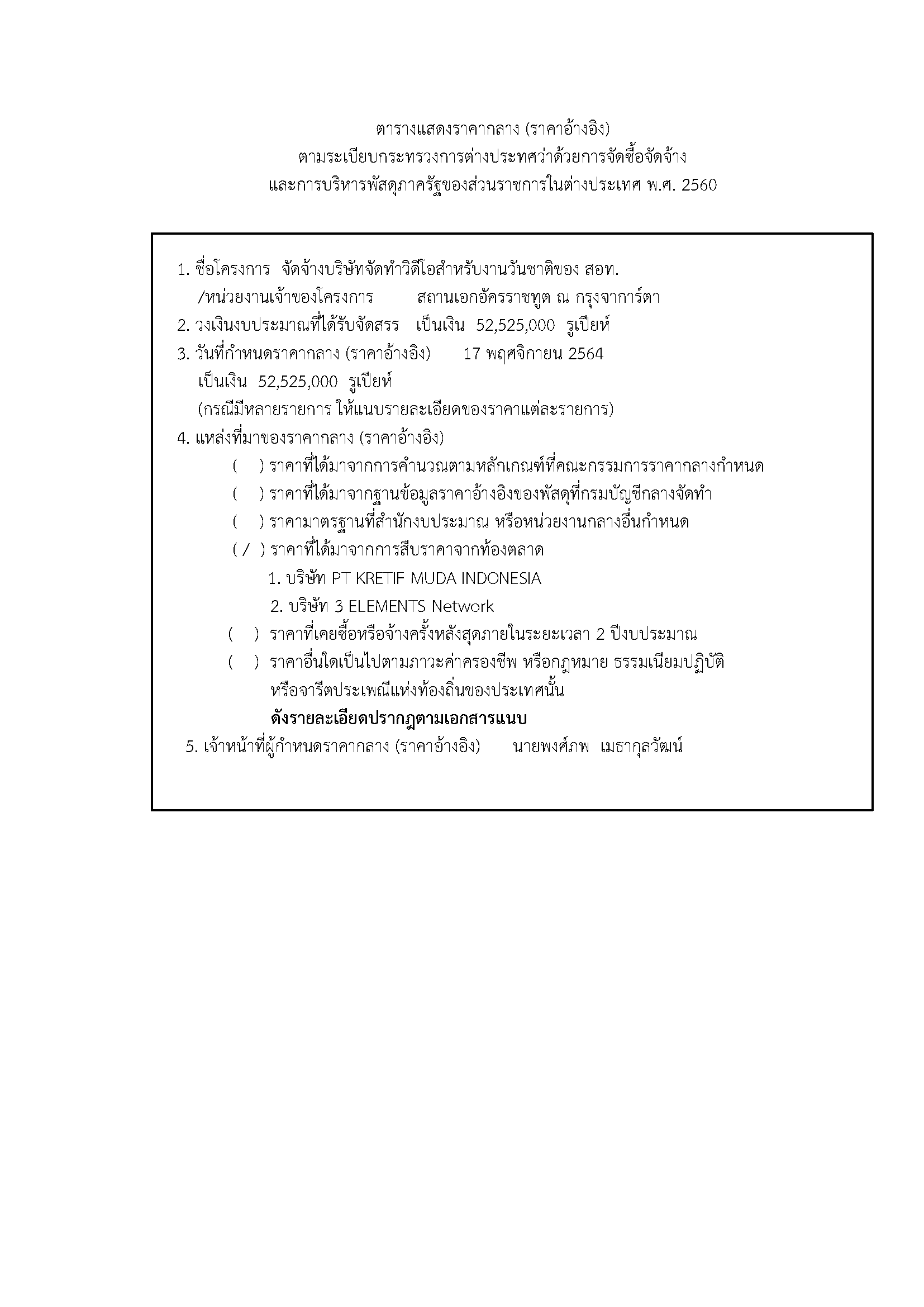 ประกาศราคากลางสำหรับการจัดจ้างบริษัทจัดทำวีดิโอสำหรับงานวันชาติ