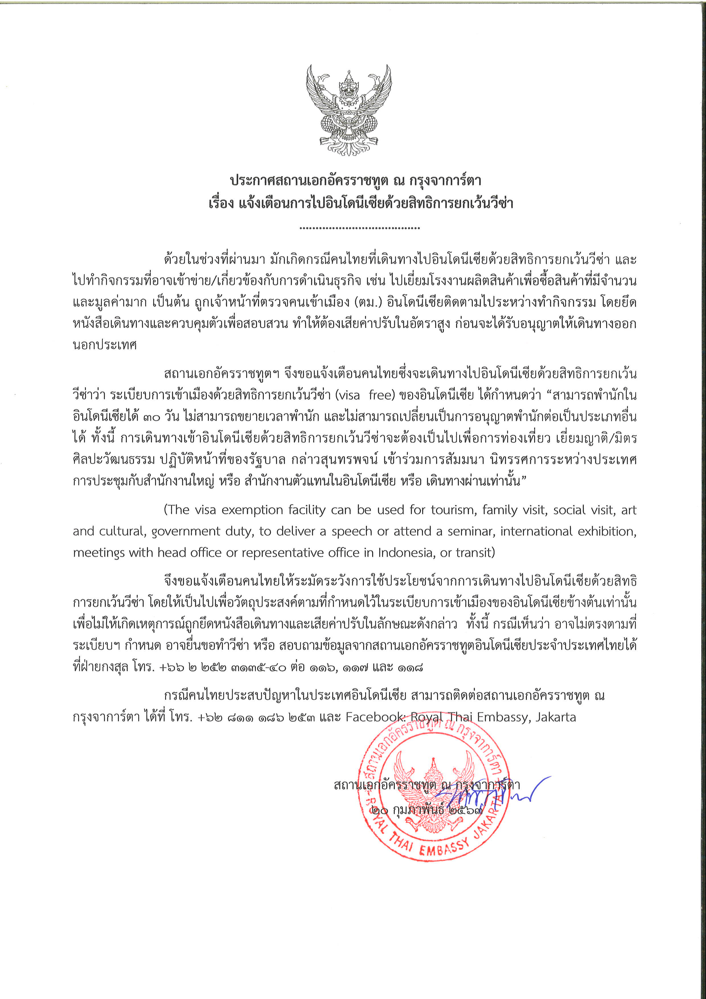 ประกาศสถานเอกอัครราชทูต ณ กรุงจาการ์ตา เรื่อง แจ้งเตือนการไปอินโดนีเซียด้วยสิทธิการยกเว้นวีซ่า 20 ก.พ. 2563
