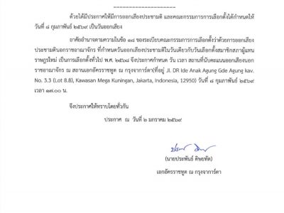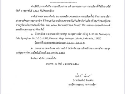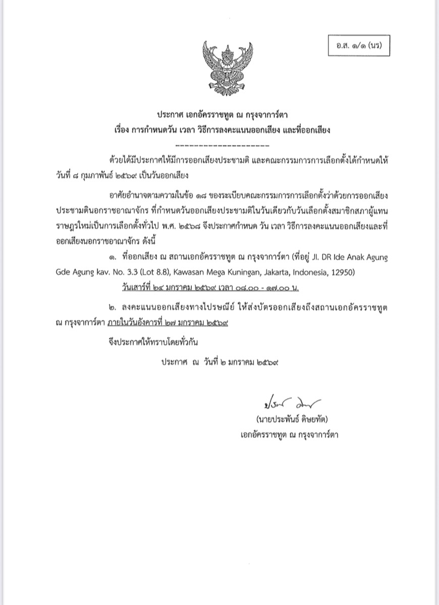 ประกาศสถานเอกอัครราชทูต ณ กรุงจาการ์ตา (1) เรื่อง การกำหนดวัน เวลา วิธีการลงคะแนนออกเสียง และที่ออกเสียง และ (2) เรื่อง วัน เวลา สถานที่นับคะแนนออกเสียงนอกราชอาณาจักร