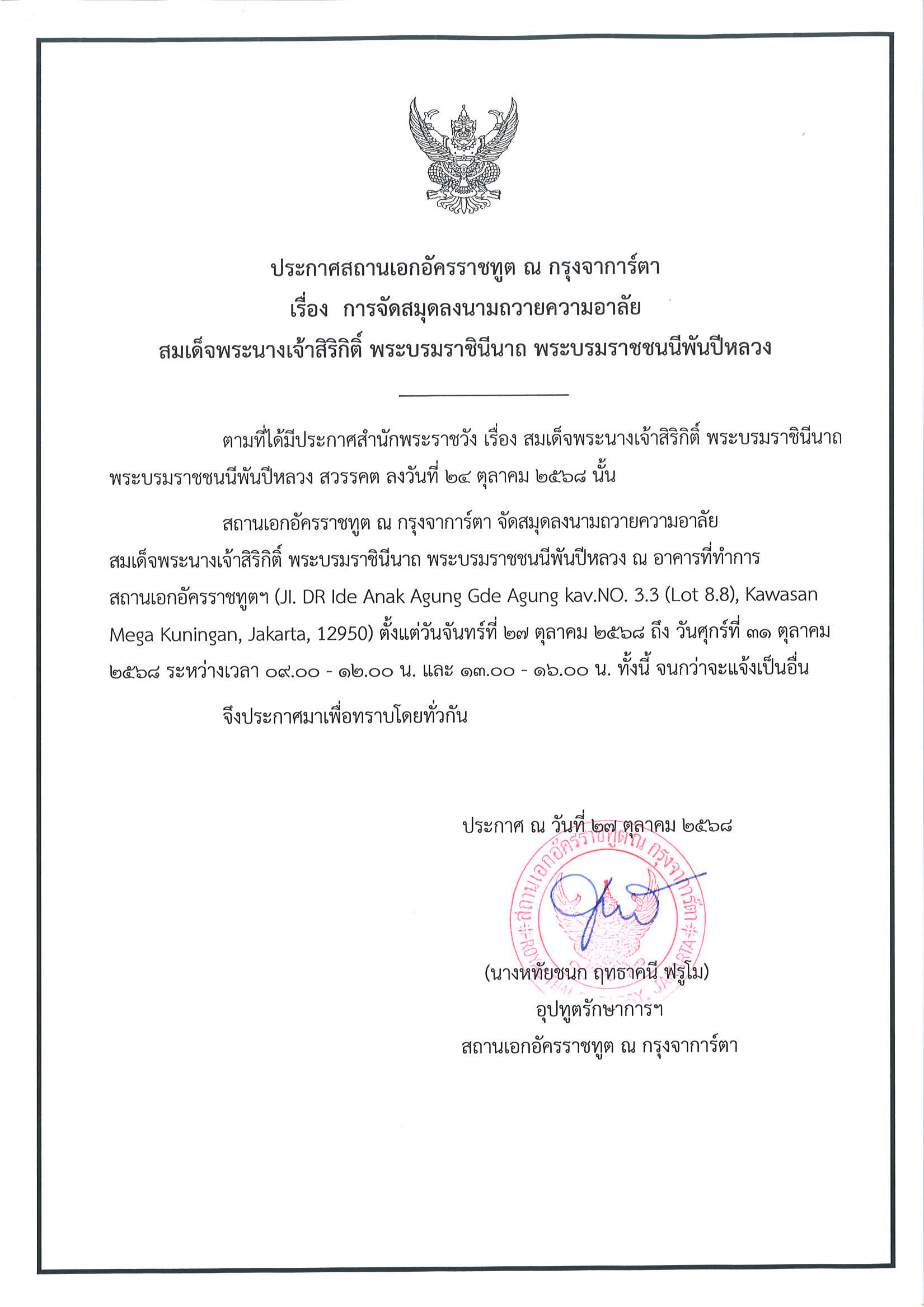 ประกาศ เรื่อง การจัดสมุดลงนามถวายความอาลัยสมเด็จพระนางเจ้าสิริกิติ์ พระบรมราชินีนาถ พระบรมราชชนนีพันปีหลวง