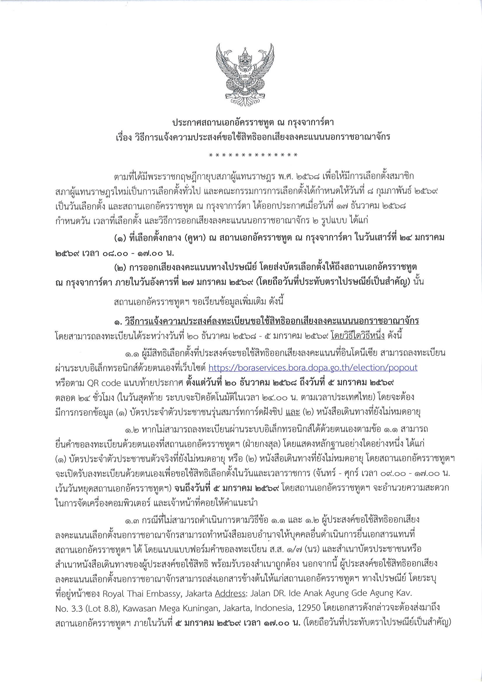 ประกาศ เรื่อง วิธีการแจ้งความประสงค์ขอใช้สิทธิออกเสียงลงคะแนนนอกราชอาณาจักร