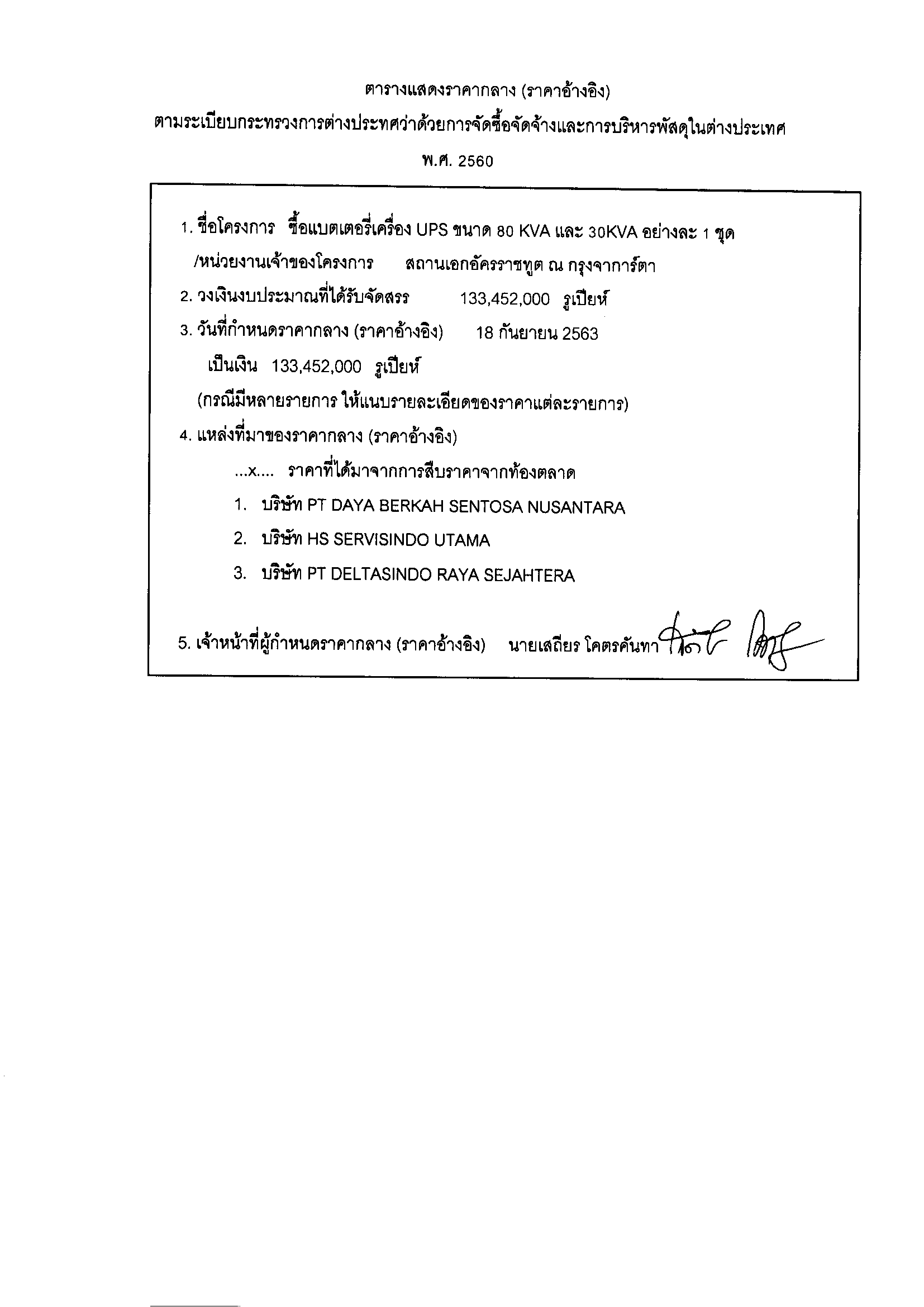 ราคากลางซื้อแบตเตอรี่เครื่อง UPS ที่ทำการสถานเอกอัครราชทูตฯ และทำเนียบเอกอัครราชทูต