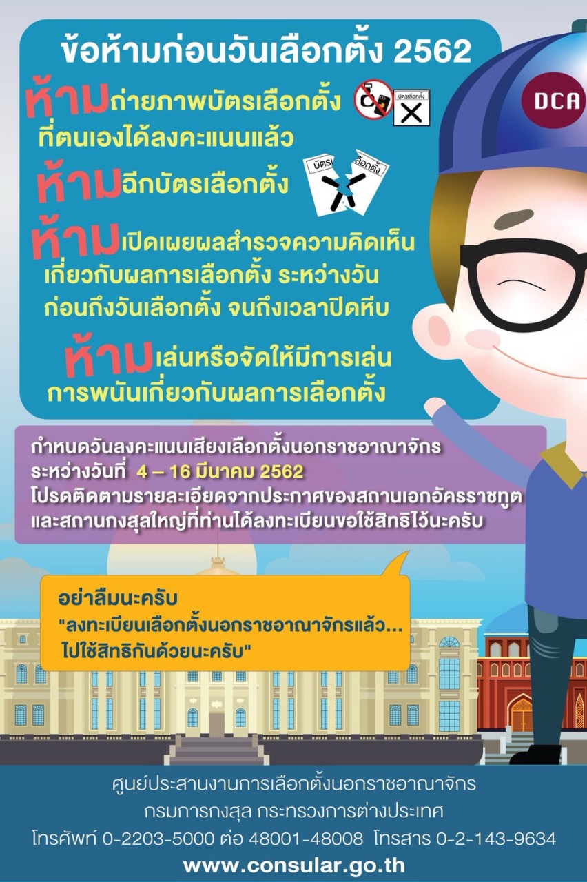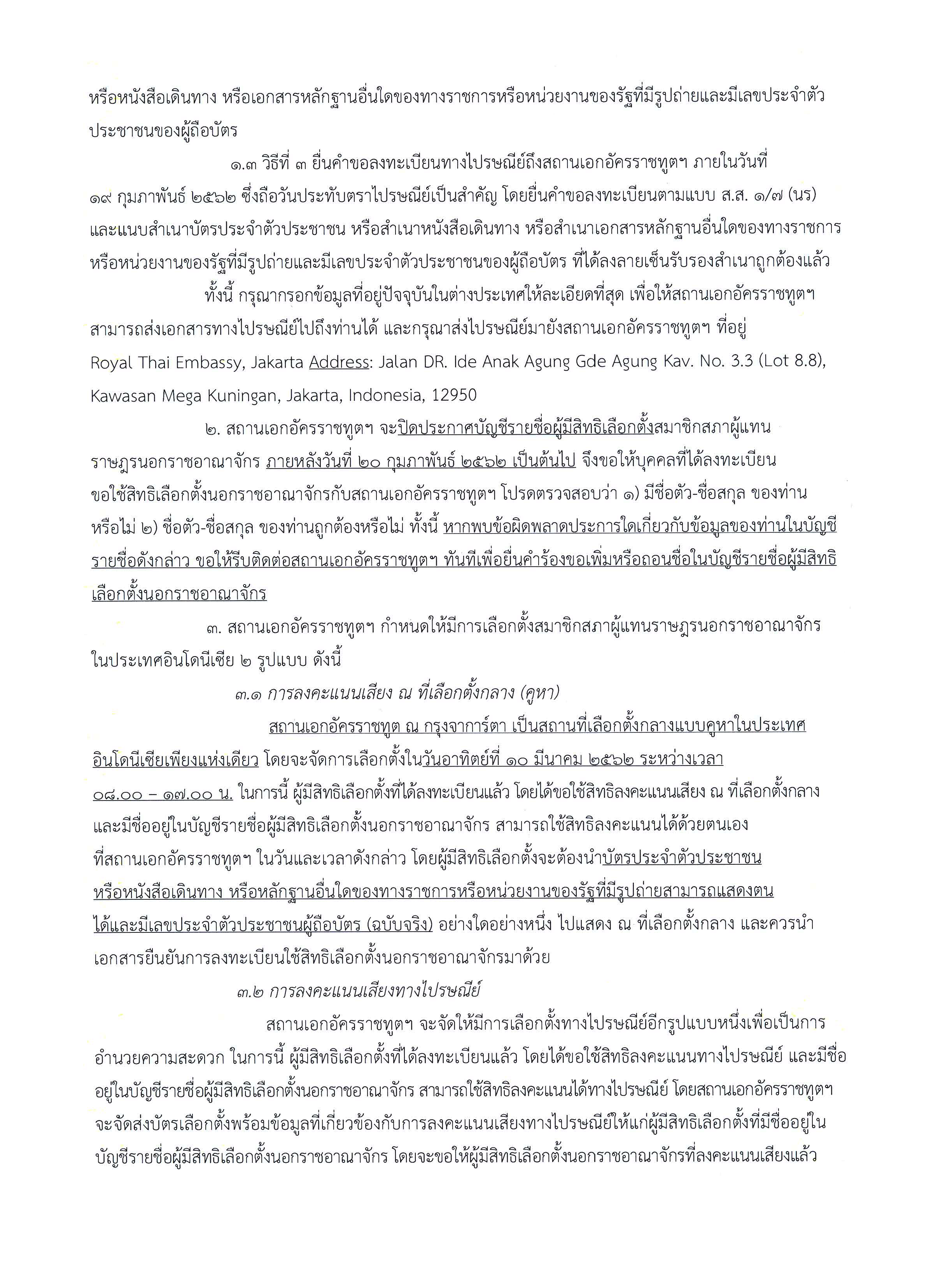 3. สถานเอกอัครราชทูต ณ กรุงจาการ์ตา จะจัดการเลือกตั้งแบบคูหาในวันอาทิตย์ที่ 10 มีนาคม 2562 ระหว่างเวลา 8.00 – 17.00 น. (ที่อยู่ JI. DR Ide Anak Agung Gde Agung kav. NO. 3.3 (Lot 8.8), Kawasan Mega Kuningan, Jakarta, Indonesia, 12950) โดยผู้มีสิทธิเลือกตั้งฯ จะต้องนำบัตรประจำตัวประชาชน หรือหนังสือเดินทาง หรือหลักฐานอื่นใดของทางราชการหรือหน่วยงานของรัฐที่มีรูปถ่ายสามารถแสดงตนได้และมีเลขประจำตัวประชาชน มาแสดง และนำเอกสารยืนยันผลการลงทะเบียนใช้สิทธิเลือกตั้งฯ มาด้วย
