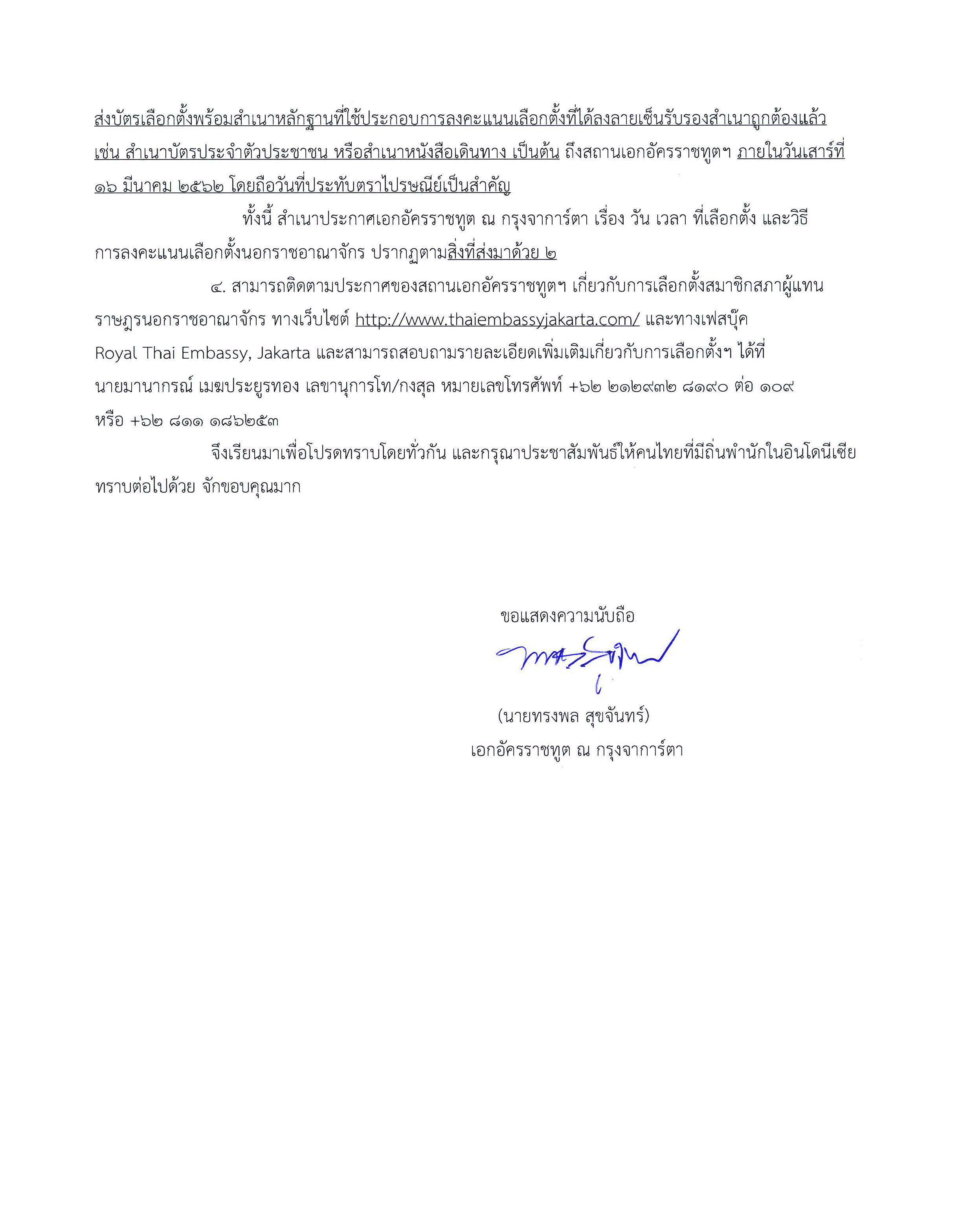 สิ่งที่ส่งมาด้วย    ๒. ประกาศเอกอัครราชทูต ณ กรุงจาการ์ตา เรื่อง วัน เวลา ที่เลือกตั้ง และวิธีการออกเสียง ลงคะแนนนอกราชอาณาจักร