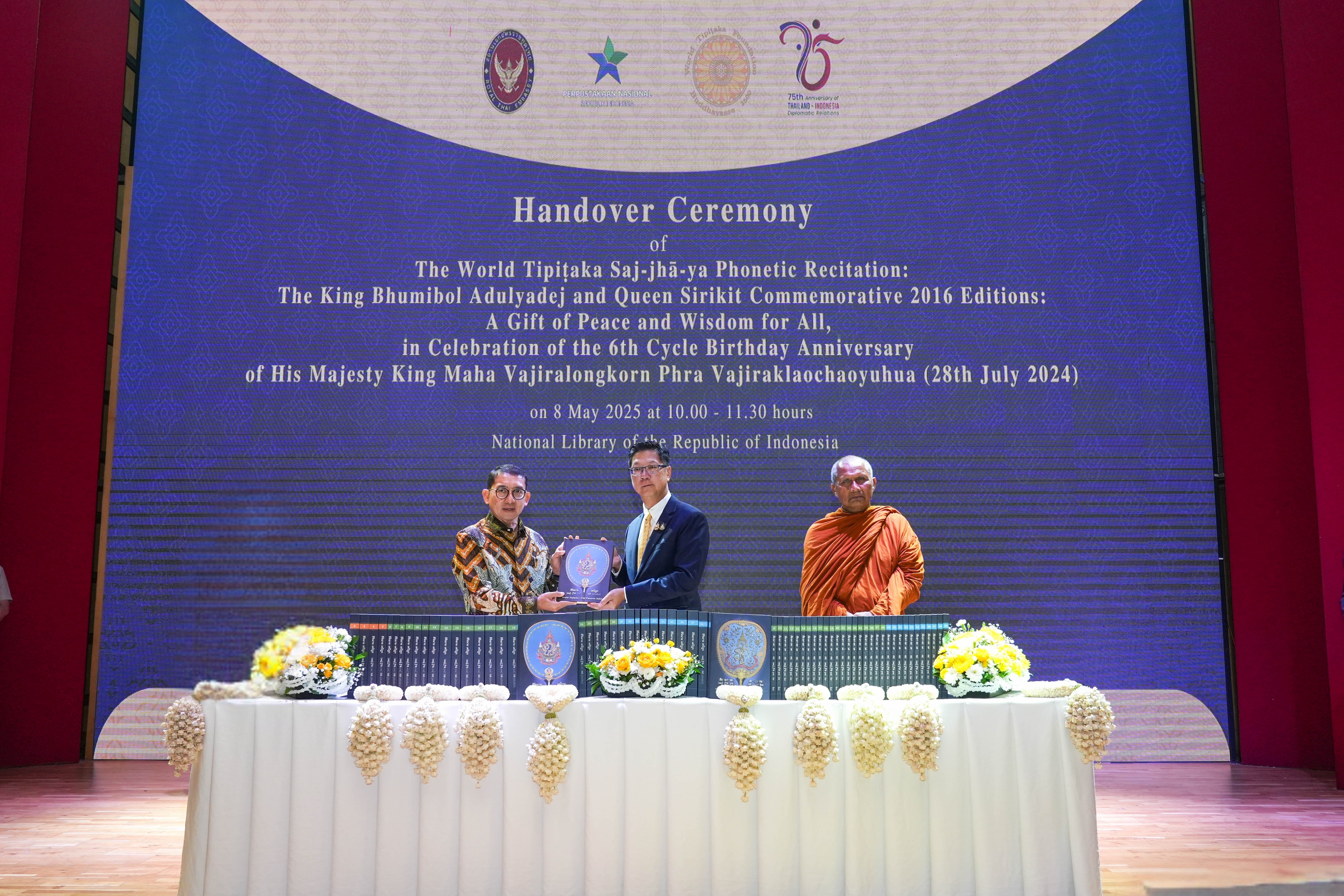 เมื่อวันที่ 8 พฤษภาคม 2568 สถานเอกอัครราชทูต ณ กรุงจาการ์ตา ร่วมกับหอสมุดแห่งชาติสาธารณรัฐอินโดนีเซีย และมูลนิธิพระไตรปิฎกสากล จัดพิธีมอบพระไตรปิฎกสากล ฉบับสัชฌายะ ชุด ภ.ป.ร. และชุด ส.ก. พ.ศ. 2559 แก่ฝ่ายอินโดนีเซีย โดยมีนายประพันธ์ ดิษยทัต เอกอัครราชทูต ณ กรุงจาการ์ตา และพระธรรมวชิรญาณโกศล หฤทัยถาวร เป็นผู้แทนฝ่ายไทยในการมอบพระไตรปิฎกฯ และนายฟัดลี ซน รัฐมนตรีว่าการกระทรวงวัฒนธรรมสาธารณรัฐอินโดนีเซีย เป็นแขกเกียรติยศในการรับมอบพระไตรปิฎกฉบับดังกล่าว พิธีดังกล่าวมีผู้เข้าร่วมกว่า 70 คน อาทิ หัวหน้าสำนักงานทีมประเทศไทยและคู่สมรส เจ้าหน้าที่ระดับสูงกระทรวงวัฒนธรรมสาธารณรัฐอินโดนีเซีย ผู้แทนจากกระทรวงการต่างประเทศและกระทรวงกิจการศาสนาสาธารณรัฐอินโดนีเซีย คณะทูตานุทูต สมาชิกมูลนิธิพระไตรปิฎกสากล และผู้แทนองค์กรพุทธศาสนาในอินโดนีเซีย