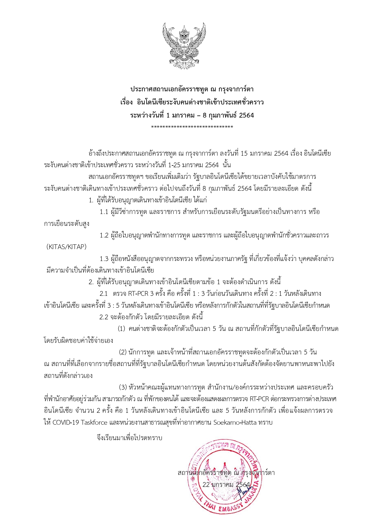 อินโดนีเซียระงับคนต่างชาติเข้าประเทศชั่วคราว ระหว่างวันที่ 1 มกราคม – 8 กุมภาพันธ์ 2564
