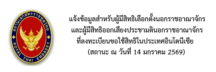วันนี้ (14 มกราคม 2569) สถานเอกอัครราชทูต ณ กรุงจาการ์ตา ได้ส่งเอกสารและบัตรเลือกตั้ง บัตรออกเสียงประชามติ เอกสารสำคัญ และคำแนะนำขั้นตอนดำเนินการให้แก่ผู้มีสิทธิลงคะแนนและออกเสียงประชามติในอินโดนีเซีย ตามที่อยู่ที่ท่านได้แจ้งไว้ตอนลงทะเบียนใช้สิทธิ