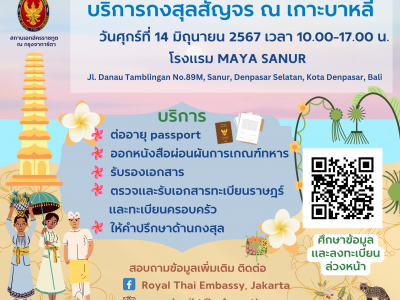 28 พ.ค. 2567 ขอเชิญผู้สนใจเข้ารับบริการกงสุลสัญจร ณ เมืองเดนปาซาร์ จังหวัดบาหลี ในวันศุกร์ที่ 14 มิถุนายน 2567