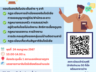 27 มิ.ย. 2567 ขอเชิญเข้าร่วมรับฟังการบรรยายหัวข้อ “กฎหมายอินโดนีเซียน่ารู้” ในวันพุธที่ 24 กรกฎาคม 2567