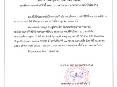 27 ต.ค. 2568 ประกาศ เรื่อง การจัดสมุดลงนามถวายความอาลัยสมเด็จพระนางเจ้าสิริกิติ์ พระบรมราชินีนาถ พระบรมราชชนนีพันปีหลวง
