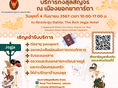 2 พ.ย. 2567 สถานเอกอัครราชทูต ณ กรุงจาการ์ตา ขอเรียนเชิญชุมชนไทยเข้าร่วมพิธีอัญเชิญผ้าพระกฐินพระราชทานมาทอดถวาย ณ วัดจาการ์ตาธรรมจักรชยะ ในวันเสาร์ที่ 9 พฤศจิกายน 2567 เวลา 09.00 น.