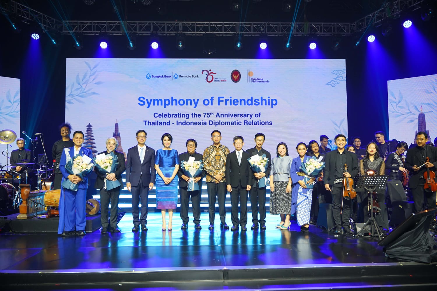 เมื่อวันที่ 11 กรกฎาคม 2568 สถานเอกอัครราชทูต ณ กรุงจาการ์ตา ร่วมกับธนาคาร Permata ธนาคารกรุงเทพ และมูลนิธิ Bandung Philharmonic จัดการแสดงดนตรี “Symphony of Friendship: Celebrating the 75th Anniversary of Thailand – Indonesia Diplomatic Relations” เพื่อเฉลิมฉลอง 75 ปีความสัมพันธ์ทางการทูตระหว่างไทยกับสาธารณรัฐอินโดนีเซีย ณ Jakarta Concert Hall บรรเลงโดยวงดุริยางค์ซิมโฟนี และควบคุมวงโดยนาย Erwin Gutawa วาทยากรชาวอินโดนีเซียที่มีชื่อเสียง ร่วมกับ ผศ. อภิชัย เลี่ยมทอง หัวหน้าหลักสูตรดุริยางคศาสตรบัณฑิต มหาวิทยาลัยรังสิต และสมาชิกวงดุริยางค์ Royal Bangkok Symphony Orchestra และนายณชพล ทิพย์ธัญ วงดุริยางค์ Bandung Philharmonic Orchestra โดยมีนายประพันธ์ ดิษยทัต เอกอัครราชทูต ณ กรุงจาการ์ตา นาง Meliza M. Rusli ประธานกรรมการบริหารธนาคาร Permata และนายกอบศักดิ์ ภูตระกูล กรรมการรองผู้จัดการใหญ่ และเลขานุการบริษัท บมจ. ธนาคารกรุงเทพ ร่วมเป็นประธานกล่าวเปิดงาน