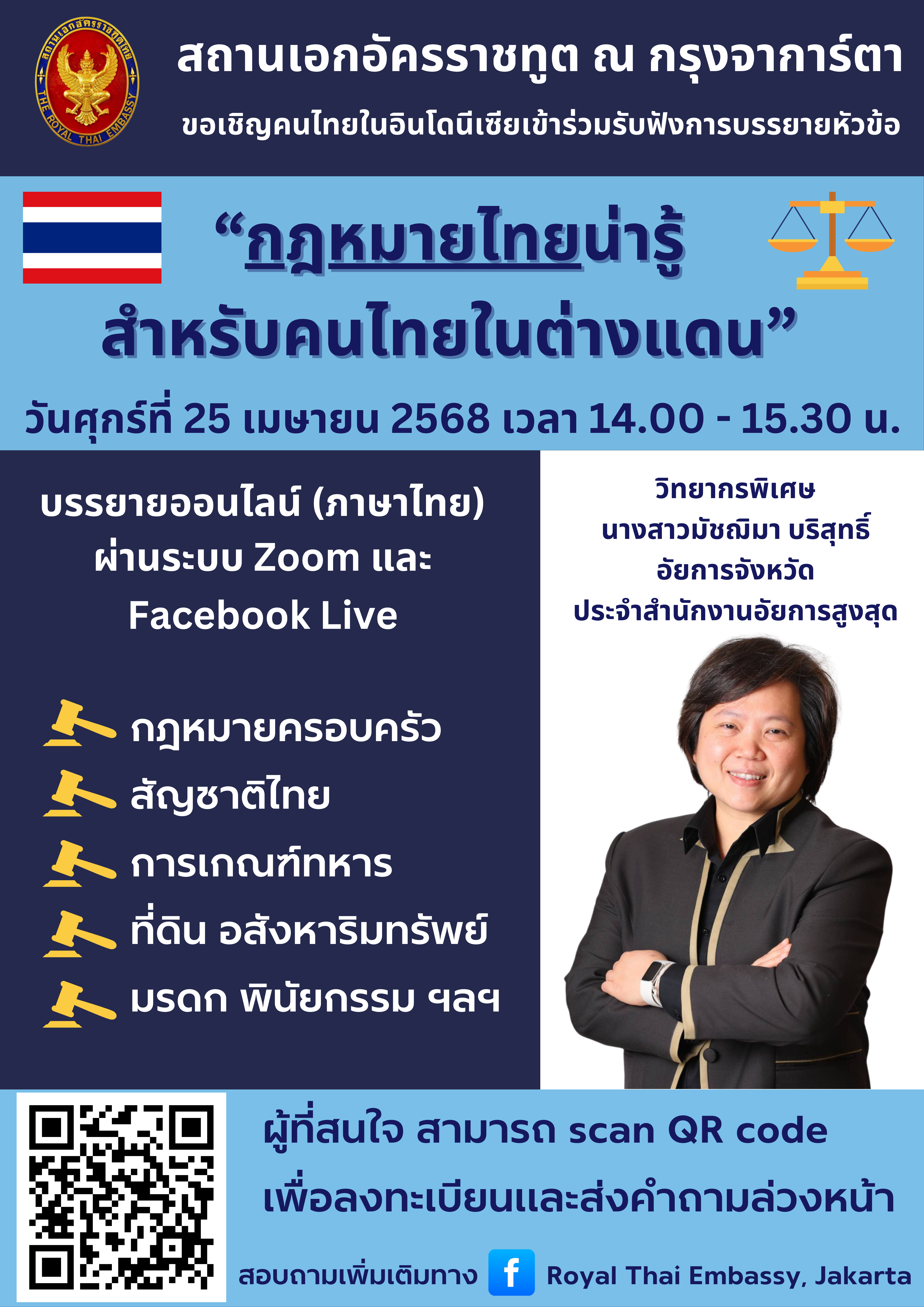 สถานเอกอัครราชทูต ณ กรุงจาการ์ตา ขอเชิญคนไทยในอินโดนีเซีย เข้าร่วมรับฟังการบรรยายออนไลน์ หัวข้อ “กฎหมายไทยน่ารู้สำหรับคนไทยในต่างแดน” วันศุกร์ที่ 25 เมษายน 2568 เวลา 14.00-15.30 น. ผ่านระบบ Zoom และ Facebook Live โดยสามารถลงทะเบียนเพื่อรับ link เข้าฟังการบรรยาย และส่งคำถามล่วงหน้าได้ทาง https://forms.gle/ihx1WspmawRWf76o6 หรือ scan QR ที่ปรากฏตามภาพ