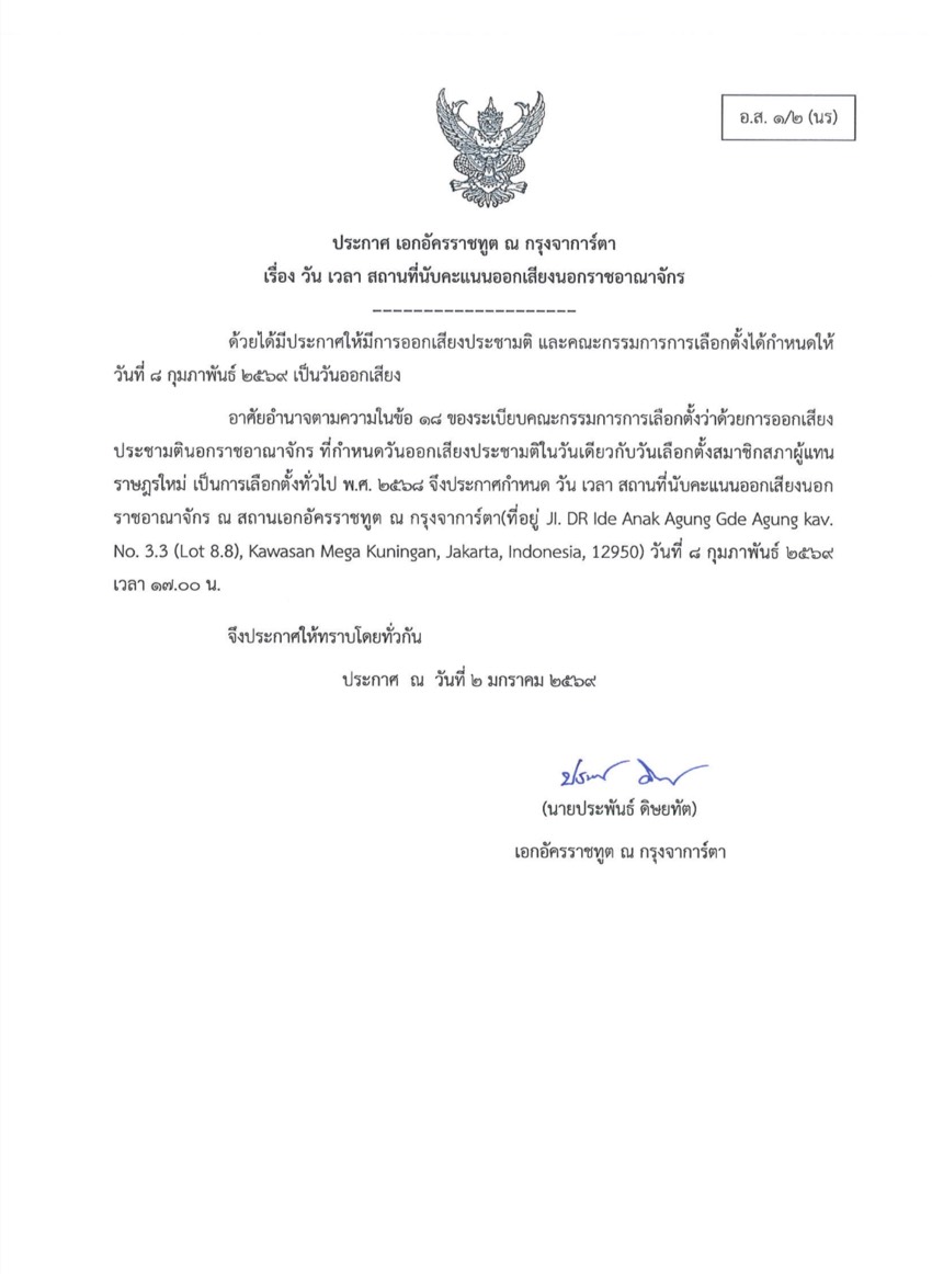 ประกาศสถานเอกอัครราชทูต ณ กรุงจาการ์ตา (1) เรื่อง การกำหนดวัน เวลา วิธีการลงคะแนนออกเสียง และที่ออกเสียง และ (2) เรื่อง วัน เวลา สถานที่นับคะแนนออกเสียงนอกราชอาณาจักร