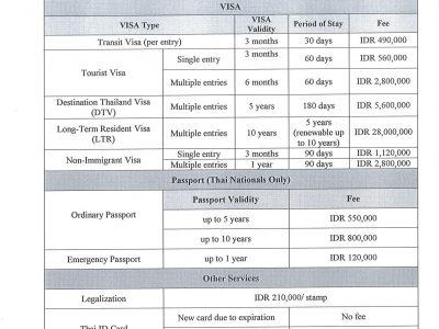 Enquiries for Visa : consular.jkt@mfa.go.th *** Launch of Online E-Visa Application Platform and Termination of Visa Application in Person*** Effective from 26 November 2024, 10.00 hrs. (UTC+7), a foreign national who is currently in Indonesia and wishes to apply for a Thai visa must apply and submit his/her application and supporting documents, and pay the application fee through the new online e-Visa platform at https://www.thaievisa.go.th/. It is no longer required for the applicant to submit his/her passport and original supporting documents in person at the Royal Thai Embassy in Jakarta. The visa processing time for all types of visas will be 10 working days (NOT including the day of submission). After the e-Visa application has been approved, a confirmation email will be sent to the applicant. The applicant is kindly requested to print a copy of the confirmation email to present to the airline at the port of departure and to Thai immigration officials in Thailand. Please note that once the visa application is submitted through the e-Visa platform, it is no longer possible to modify personal information. Incorrect information, including typographical error, will result in rejection. Therefore, it is highly recommended to carefully check all the information before the submission. The Royal Thai Embassy in Jakarta reserves the rights to request additional documents, interviews, or to reject visa applications as deemed necessary, without further explanation. Additional Information: Check if you need visa to go to Thailand here : – List of countries and territories whose nationals may apply for Visa on Arrival (VOA) – List of countries and territories whose nationals are entitled to Visa Exemption Scheme for the purpose of tourism and short-term business engagements for a period not exceeding 60 days (Ordinary Passport) – List of countries and territories which have bilateral agreement on Visa Exemption for ordinary passports with … Continue reading Important Information on Visa Application