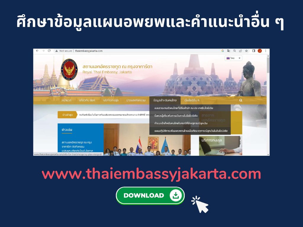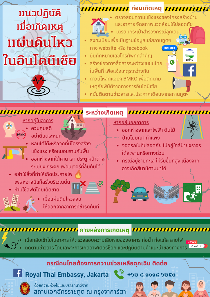- ควรติดต่อขอทราบข่าวและสถานการณ์จากแหล่งต่างๆ เช่น สถานเอกอัครราชทูตฯ หรือสถานเอกอัครราชทูตประเทศต่างๆ ในกรุงจาการ์ตา เพื่อนคนไทย เพื่อนต่างชาติที่สนิทสนม (ชาวอเมริกัน ออสเตรเลีย หรือญี่ปุ่น มักจะได้รับการแจ้งเตือนข่าวสารเป็นอย่างดีจากสถานเอกอัครราชทูตของตน) โรงเรียน และข่าวสารจากทางการอินโดนีเซีย ทั้งนี้ ควรใช้วิจารณญาณในการรับฟังข่าวสารอย่างเหมาะสม