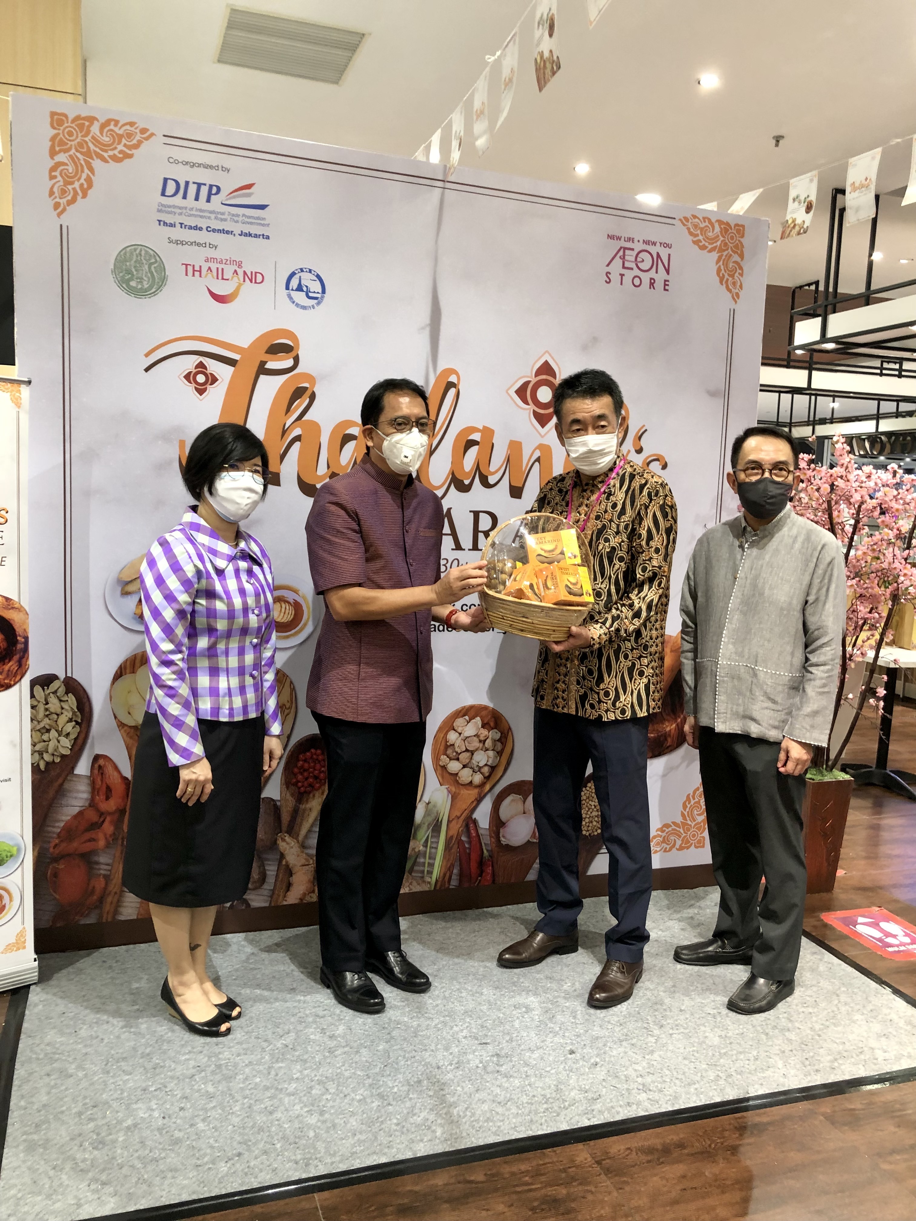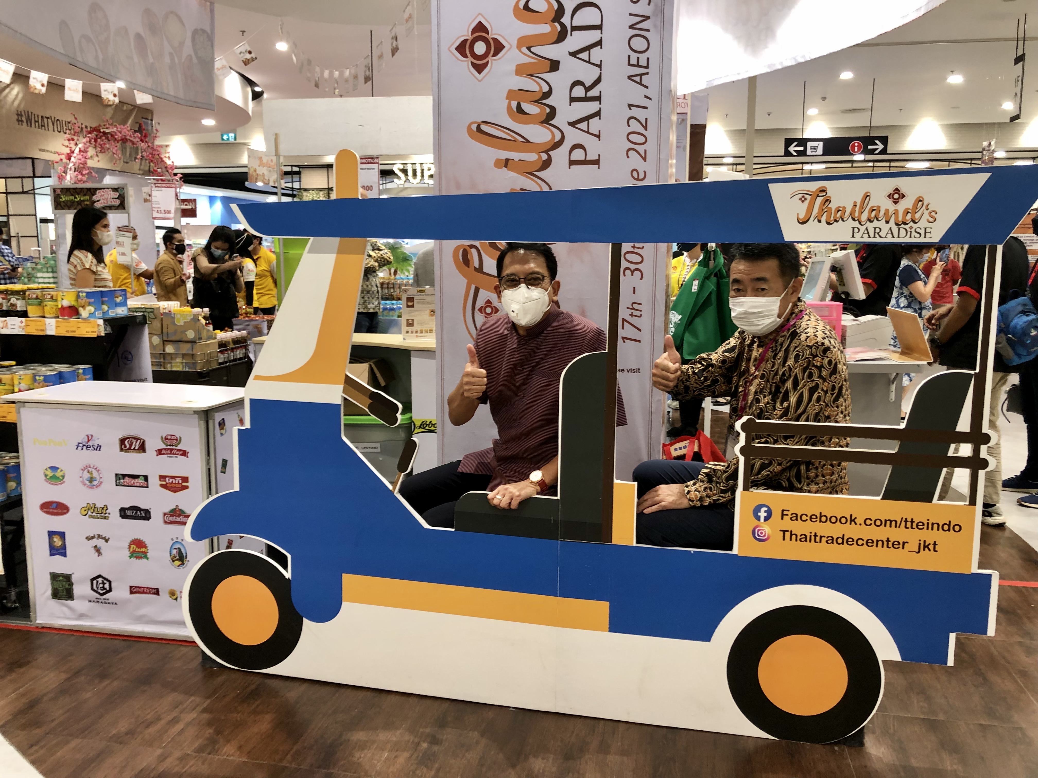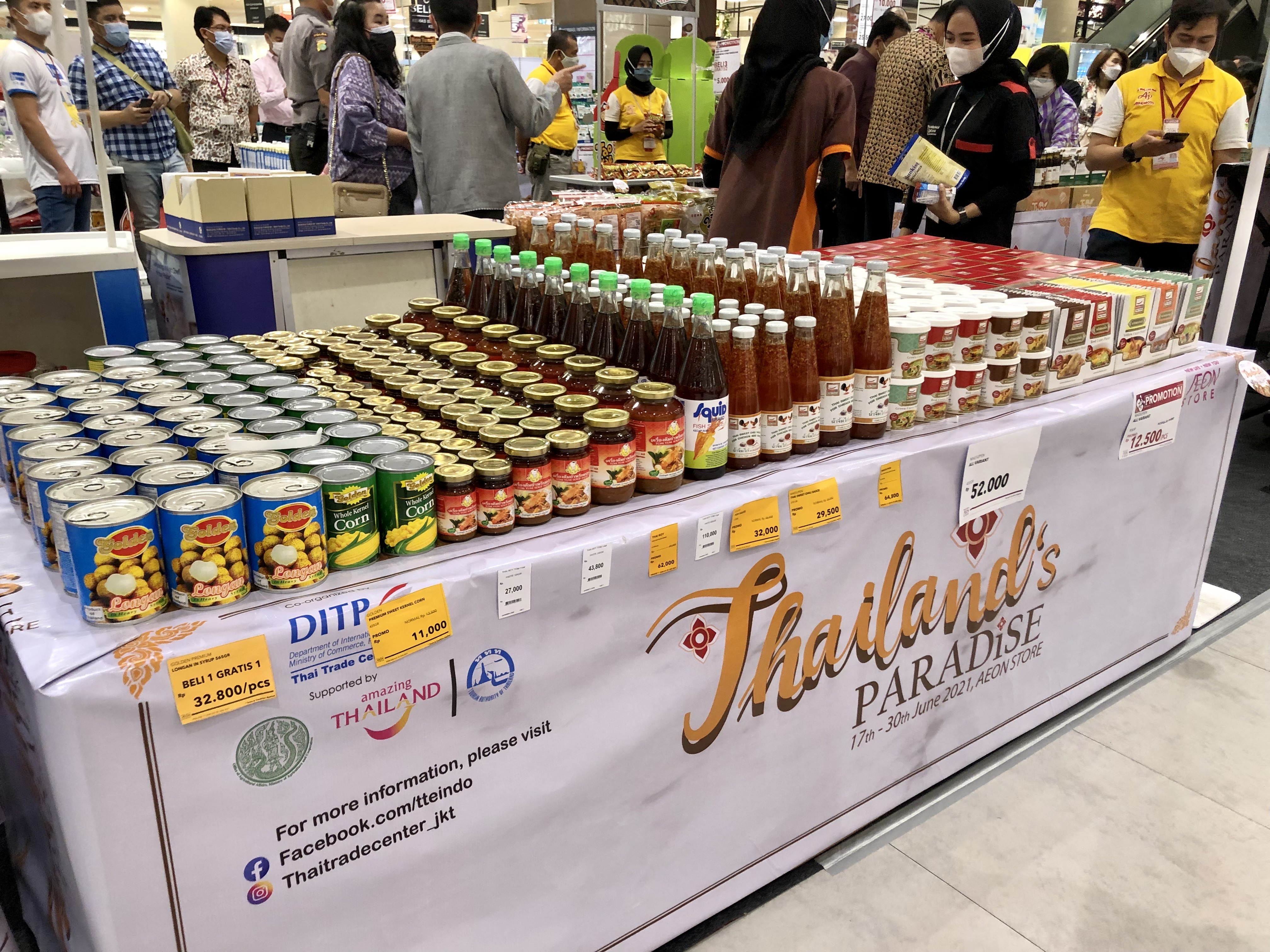 เมื่อวันที่ 17 มิถุนายน 2564 นายทรงพล สุขจันทร์ เอกอัครราชทูต ณ กรุงจาการ์ตา ได้เข้าร่วมพิธีเปิดงาน Thailand’s Paradise 2021 ที่ห้าง AEON Mall Jakarta Garden City ร่วมกับนาย Toyofumi Kashi ประธาน AEON Indonesia ซึ่งจัดโดยสำนักงานส่งเสริมการค้าในต่างประเทศ กรุงจาการ์ตา โดยมีนางจิราพร สุดานิช อัครราชทูต นางสาวภรภัทร พันธ์งอก ผู้อำนวยการสำนักงานส่งเสริมการค้าฯ และนายโสภณ ตันตโยทัย ผู้อำนวยการ ททท. ณ กรุงจาการ์ตาเข้าร่วม โดยงานมีวัตถุประสงค์เพื่อส่งเสริมการจำหน่ายสินค้าไทย และอาหารไทยในอินโดนีเซีย และมีการจำหน่ายสินค้าไทยกว่า 150 รายการ อาทิ เครื่องแกง เครื่องปรุงรส ขนมขบเคี้ยว เครื่องดื่ม ผลไม้ และสินค้าแม่และเด็ก