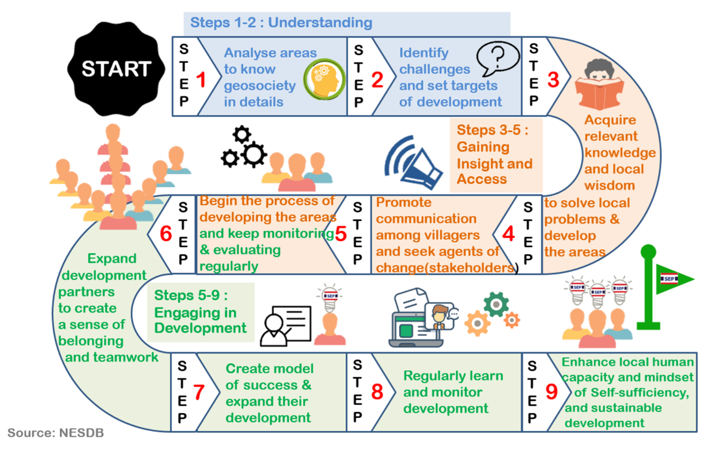 To implement our SEP-led development projects, TICA applies the 9 steps of development based on the concepts of “Understanding,” “Gaining Insight and Access,” and “Engaging in Development.”